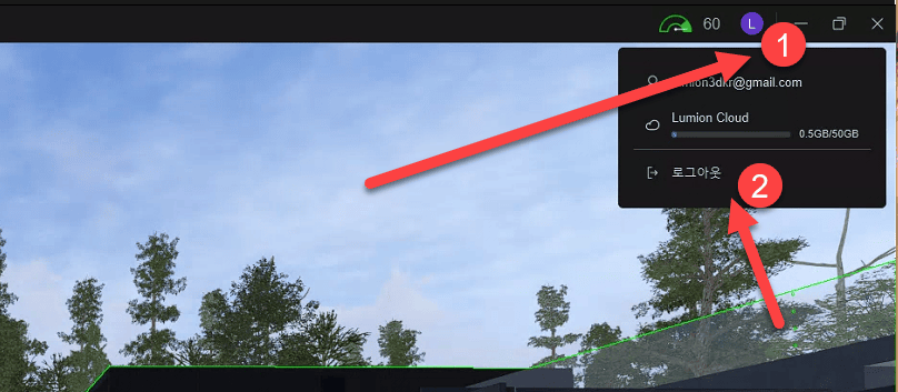 루미온 사용 중, 우측 상단에서 현재 자신의 계정(1)을 확인할 수 있다. 2번을 클릭하여 계정 혹은 라이센스를 변경할 수도 있다. 라이센스를 변경하려면, 위 그림처럼 '로그아웃'을 진행해야 한다. 이후, 다시 로그인 후, 루미온이 사용 가능한 라이센스를 찾는다. 이 중. 사용 가능한 라이센스를 선택하여 사용할 수 있다.(Named User 사용자 일 경우)